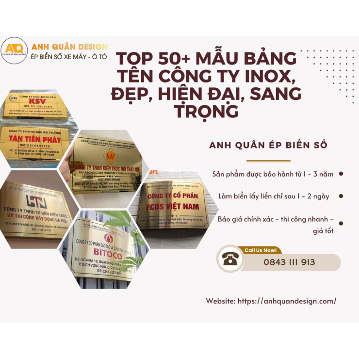 Top 50+ mẫu bảng tên công ty inox đẹp, hiện đại, sang trọng 2025 là gợi ý hoàn hảo cho doanh nghiệp muốn khẳng định sự chuyên nghiệp và đẳng cấp thương hiệu. Với ưu điểm về độ bền, thẩm mỹ cao và thiết kế linh hoạt, bảng tên inox ngày càng trở thành lựa chọn hàng đầu cho công ty, nhà hàng, khách sạn hay cơ quan. Hãy cùng Anh Quân Ép Biển Số khám phá ngay những mẫu biển công ty inox ấn tượng, sang trọng và phù hợp xu hướng mới nhất trong bài viết dưới đây.