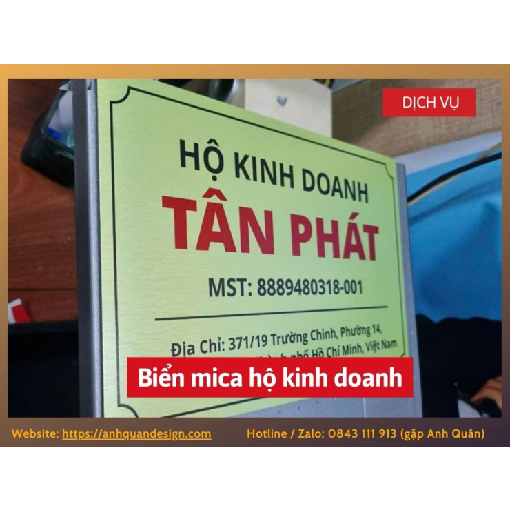 Biển mica hộ kinh doanh là giải pháp bảng hiệu đơn giản, bền đẹp và chi phí hợp lý cho cửa hàng, quầy bán nhỏ lẻ. Anh Quân Design chuyên thiết kế và thi công biển mica nhanh, rõ nét, giúp hộ kinh doanh dễ dàng tạo ấn tượng với khách hàng. Liên hệ ngay 0843 111 913 (gặp Anh Quân) để được tư vấn và làm biển đúng chuẩn, giá tốt.