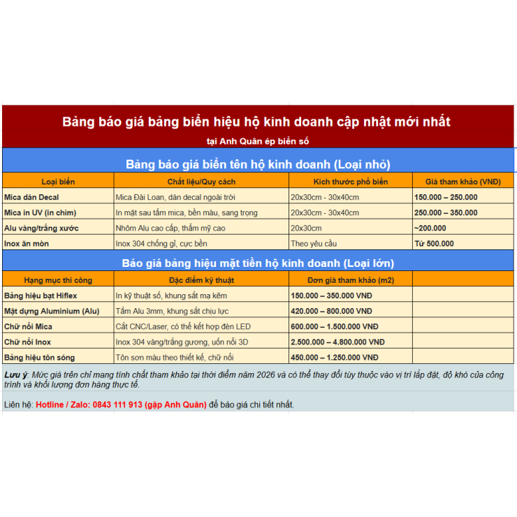 Bảng báo giá bảng biển hiệu hộ kinh doanh là thông tin quan trọng giúp chủ cửa hàng dễ dàng lựa chọn mẫu biển phù hợp với ngân sách và nhu cầu quảng bá. Anh Quân Design cung cấp nhiều giải pháp biển hiệu đẹp, bền, giá hợp lý cùng dịch vụ tư vấn tận tình. Liên hệ 0843 111 913 (gặp Anh Quân) để được báo giá nhanh và thiết kế theo yêu cầu.